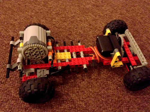 Originally I used an old 9V Technic motor, but it wasn’t strong enough to turn the rear axle. There’s a fascinating analysis of Lego motors on philohome.com which suggests that the newer motor has around 40 times more torque. I purchased one online for just $10.